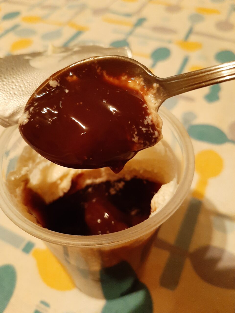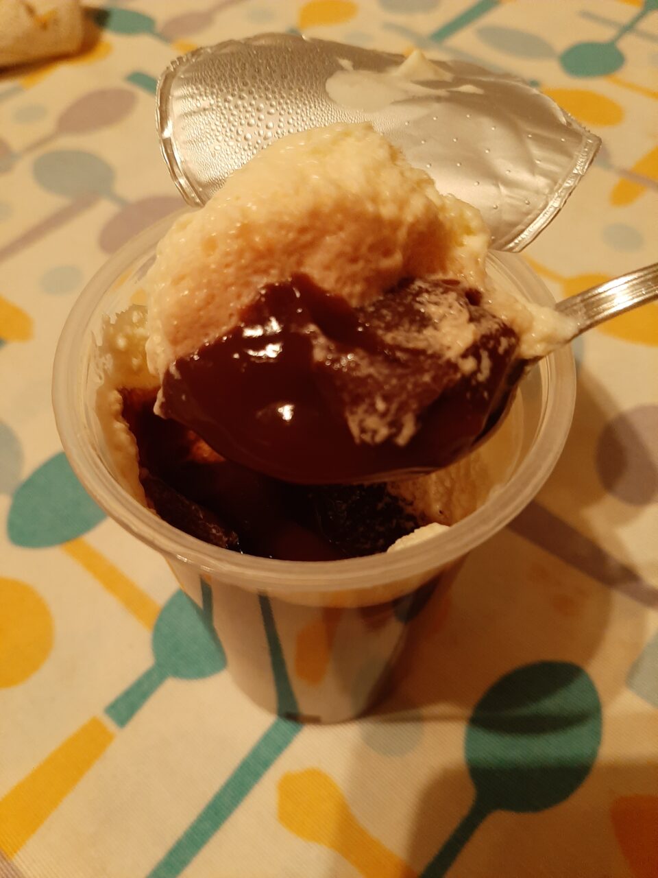 La panna è molto fluffosa, leggerissima, sembra quasi di mangiare una nuvola. Il cioccolato invece… mi aspettavo un budino e mi son ritrovata una cioccolata calda, fredda. È mooolto più liquido di quello che sembrava dall’esterno! Il sapore è molto cacaoso, ma un po’ si perde proprio per la consistenza: il dessert tende a colare e sfuggire prima che il cucchiaino raggiunga la bocca! Quindi mi ha fatto penare un po’ per mangiarlo… ma 200 grammi son andati giù come acqua. Insomma, voglia soddisfatta e portafoglio felice.